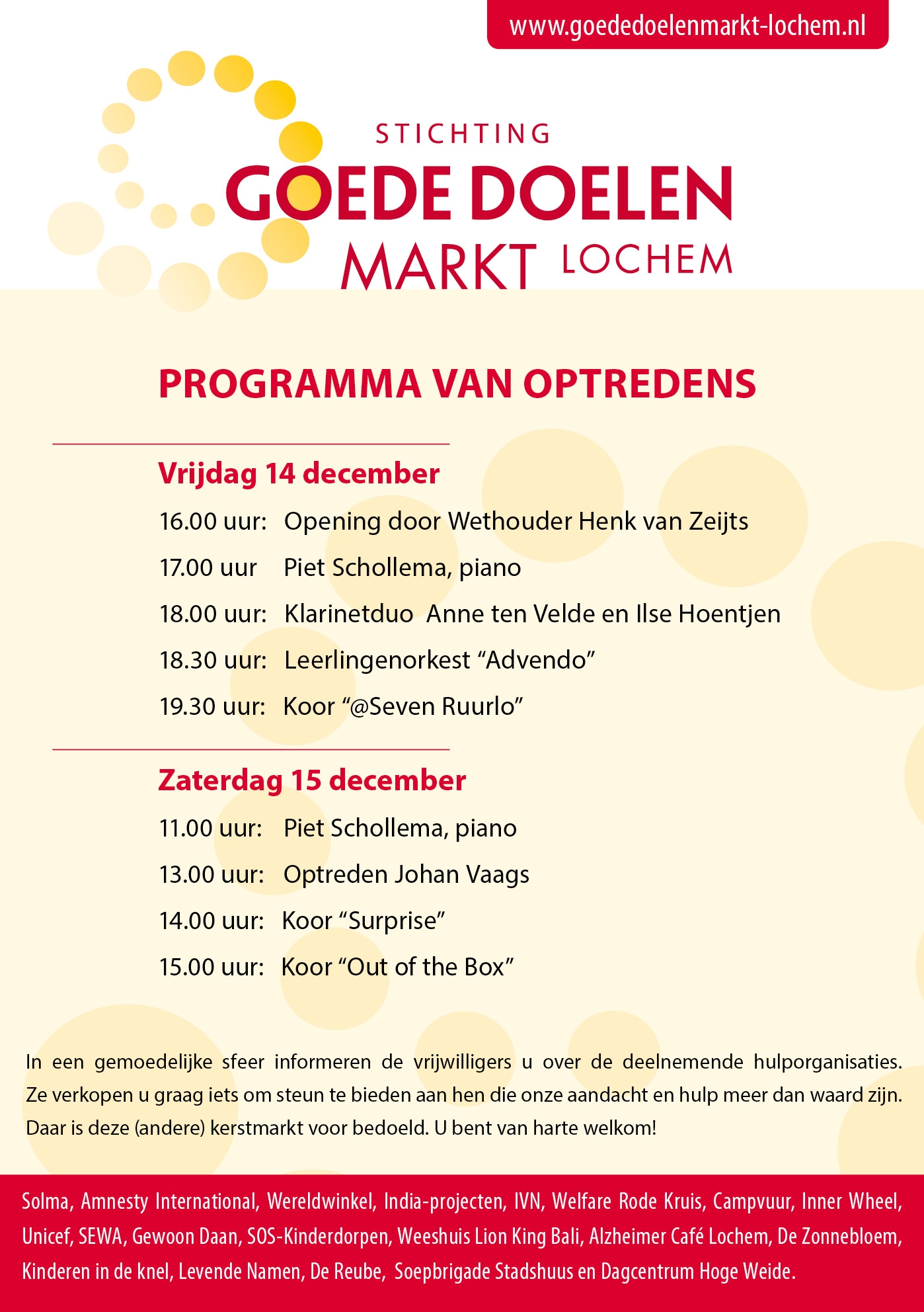 Op de vrijdag werd de markt enthousiast geopend door de wethouder van Cultuur van de gemeente Lochem, de heer Henk van Zeijts, samen met de 15-jarige Harmen Mulder die op voortreffelijke wijze zijn trombone bespeelde. De optredens werden dit jaar verzorgd door Piet Schollema op de piano, Anne ten Velde en Ilse Hoentjes op hun klarinet, het leerlingenorkest van Advendo, Johan Vaags met zangeres en door de koren Surprise en Out of the Box. Daarnaast werd op zaterdag, net na het middaguur, het carillon bespeeld in afwisseling met aanstekelijk hoorngeschal van een zestal midwinterhoornblazers.